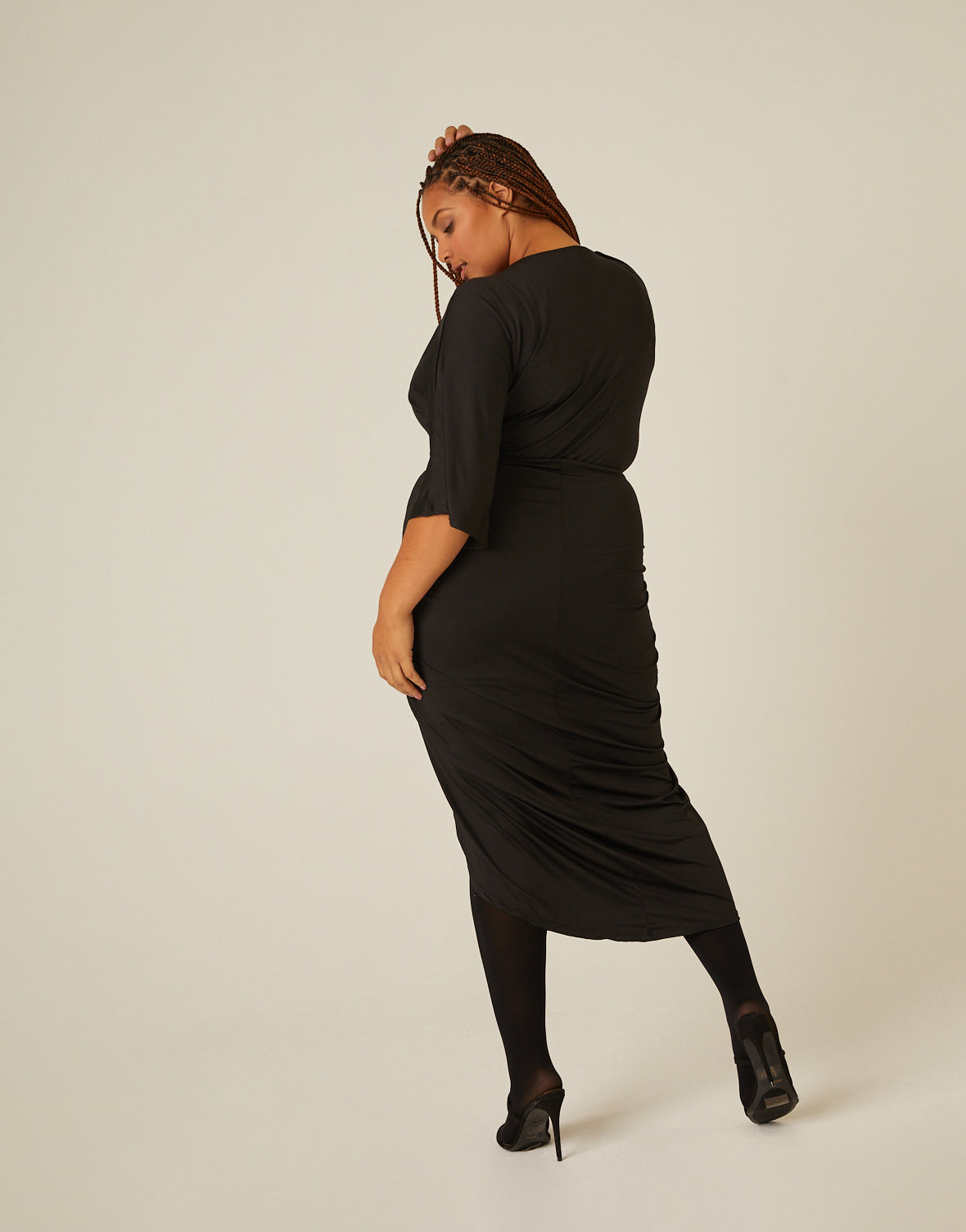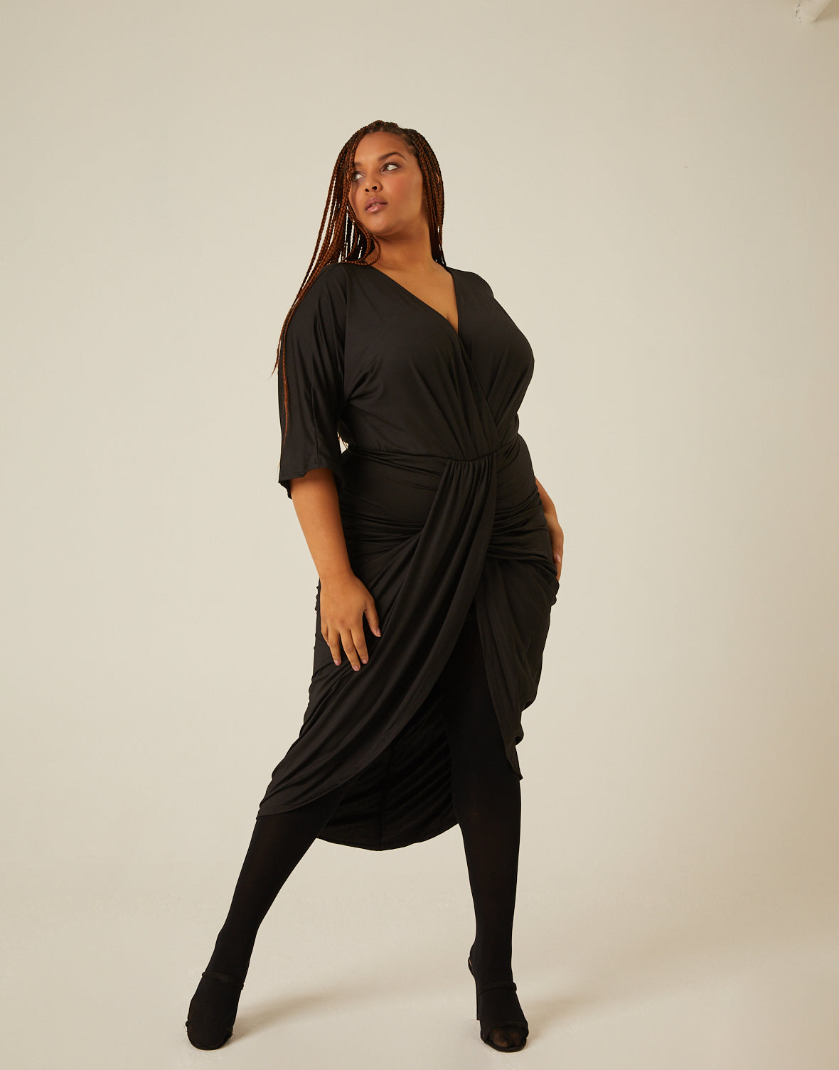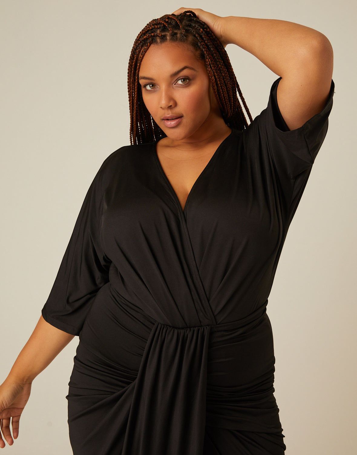 Smooth folds and a tasteful leg slit make the?Curve Gathered Drapey V Neck Dress?a cool-evening favorite. With a cute bag and a pair of boots, this plus size dress is great for a night out! With its v-shaped neckline and draping silhouette, this is sure to be the most flattering dress in your closet.