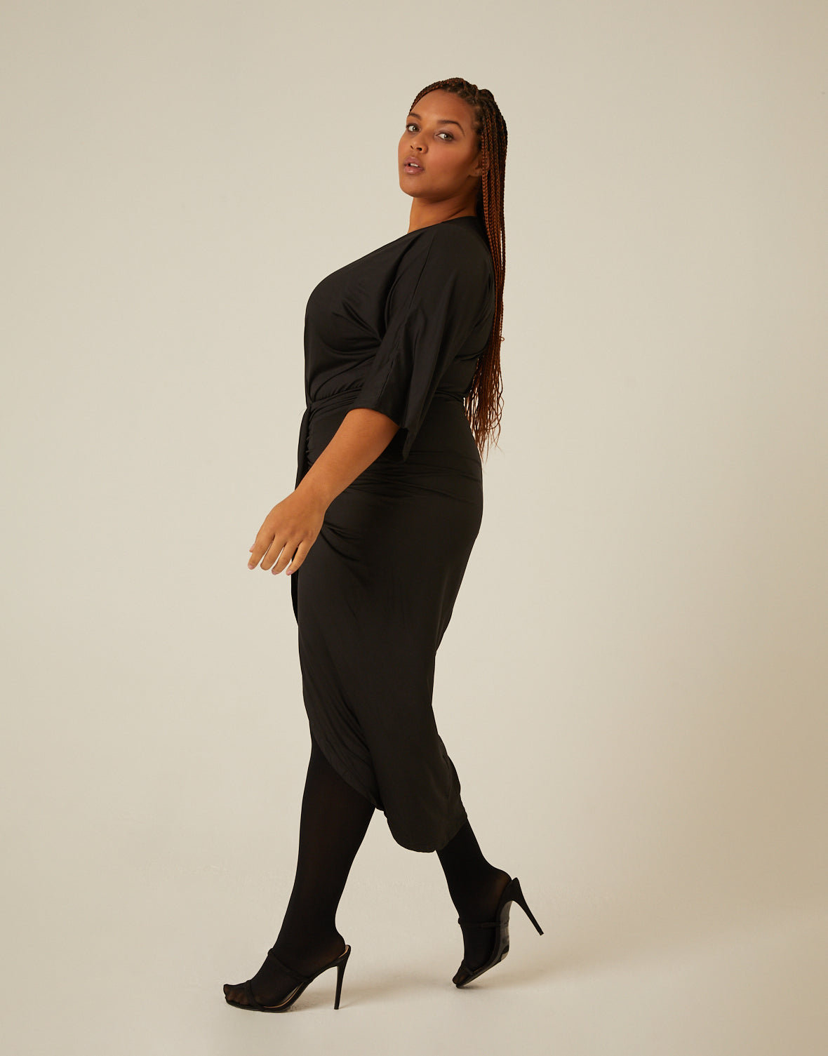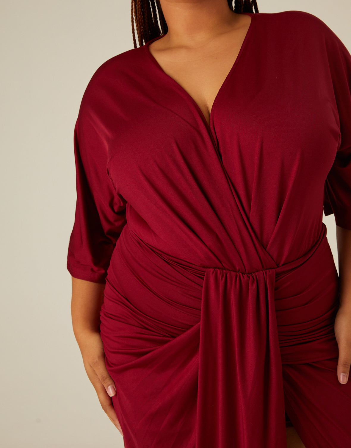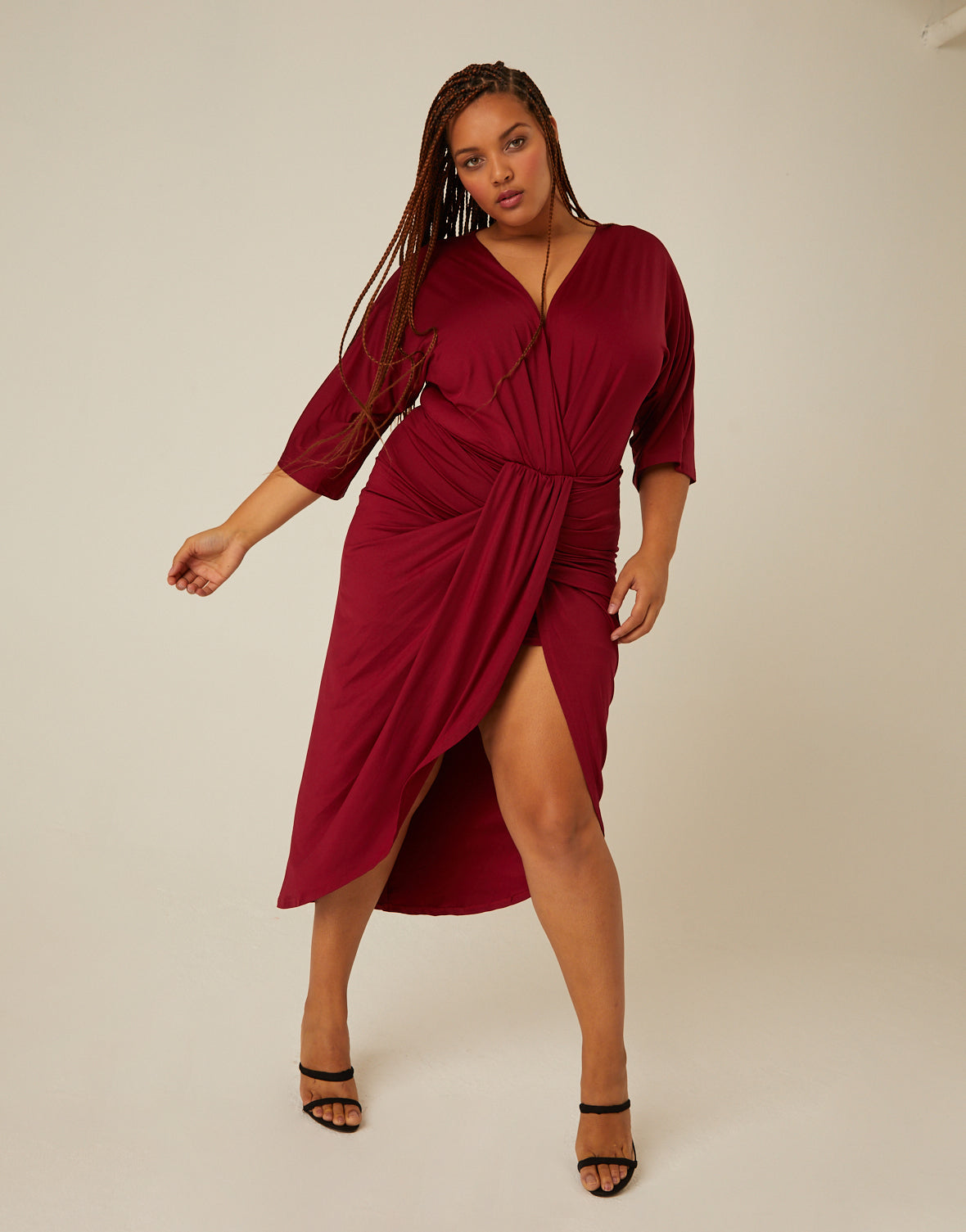 Smooth folds and a tasteful leg slit make the?Curve Gathered Drapey V Neck Dress?a cool-evening favorite. With a cute bag and a pair of boots, this plus size dress is great for a night out! With its v-shaped neckline and draping silhouette, this is sure to be the most flattering dress in your closet.