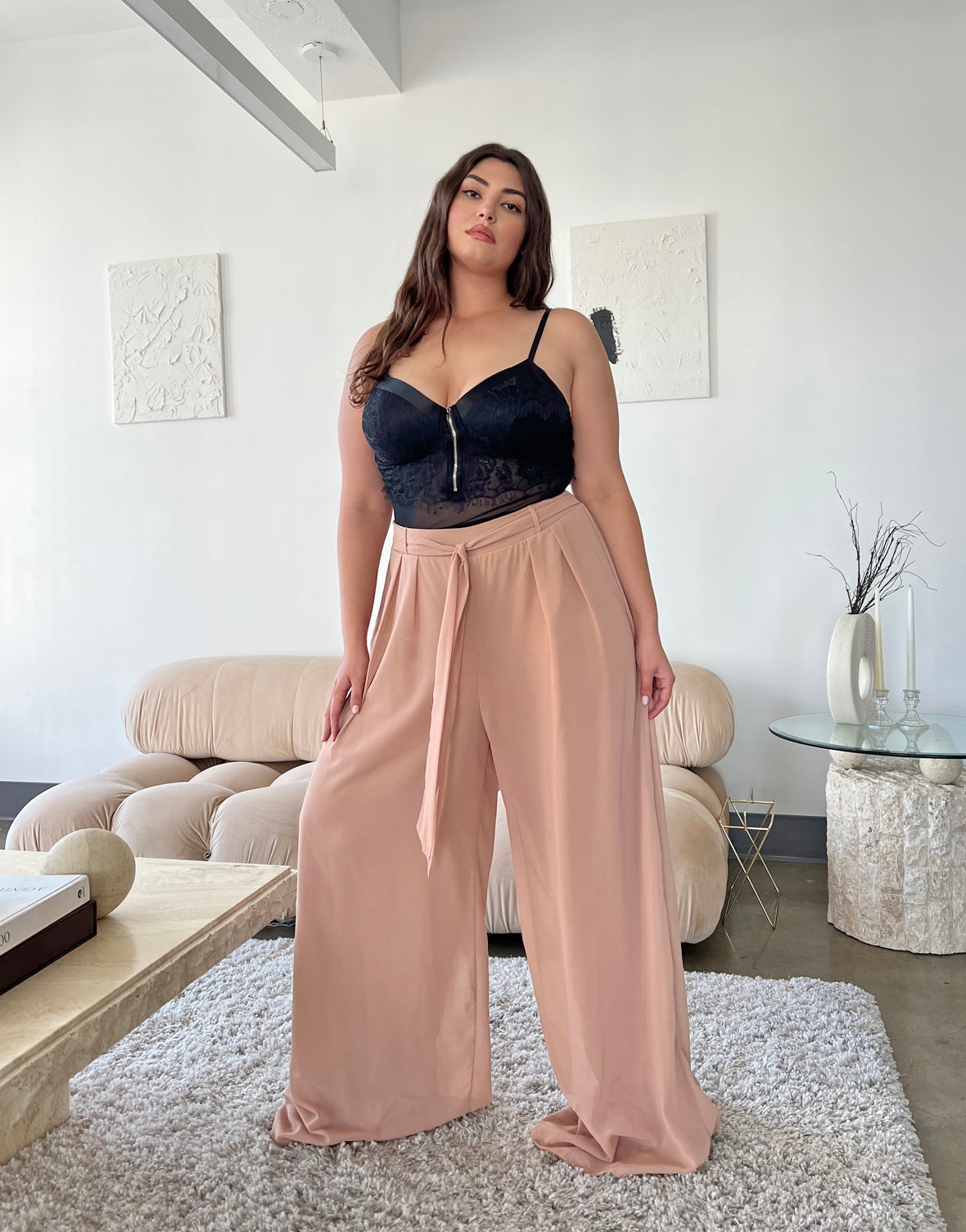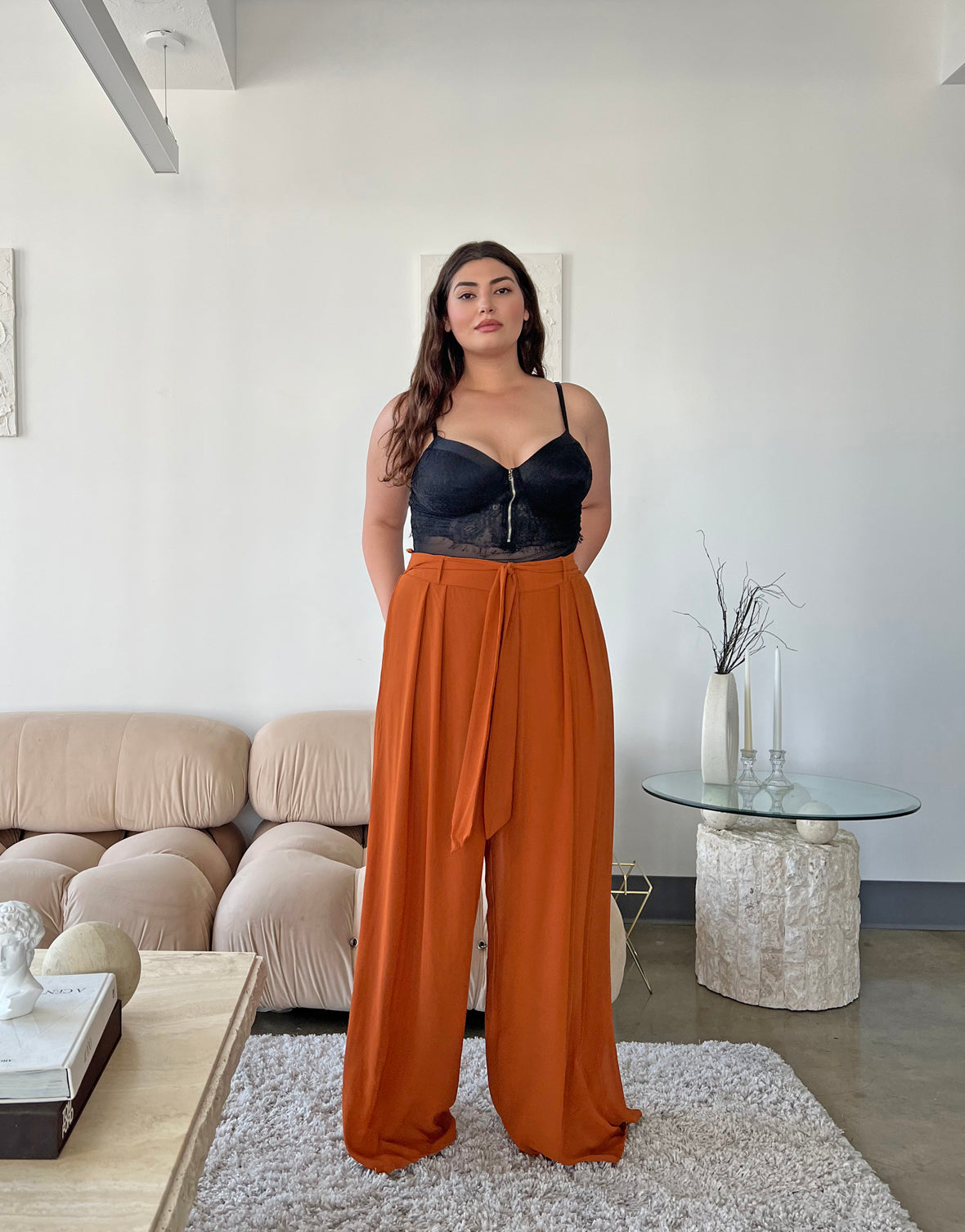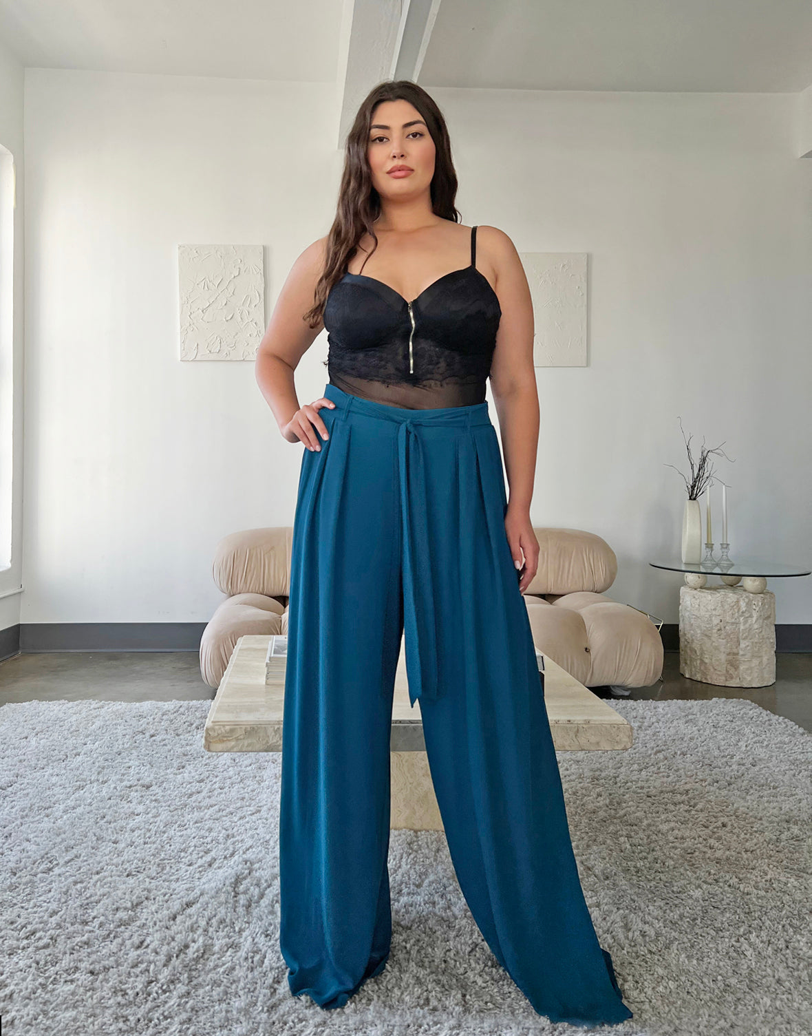 - These pants are fully lined with smooth stretchy knit material and feature a non-removable tie belt, a wide leg silhouette, and elastic at the waist.