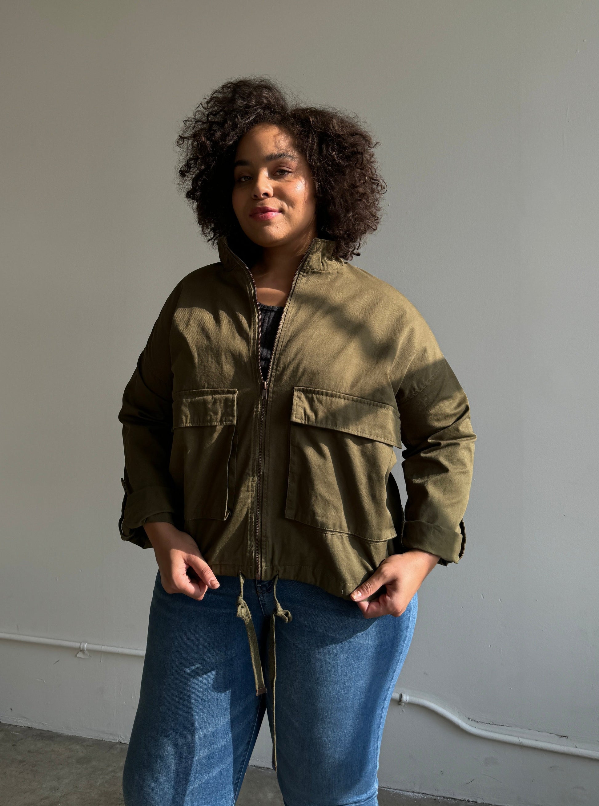 - This jacket features a full zipper down the front, a fold-down collar, two large pockets, a drawstring at the waistline, and long sleeves.