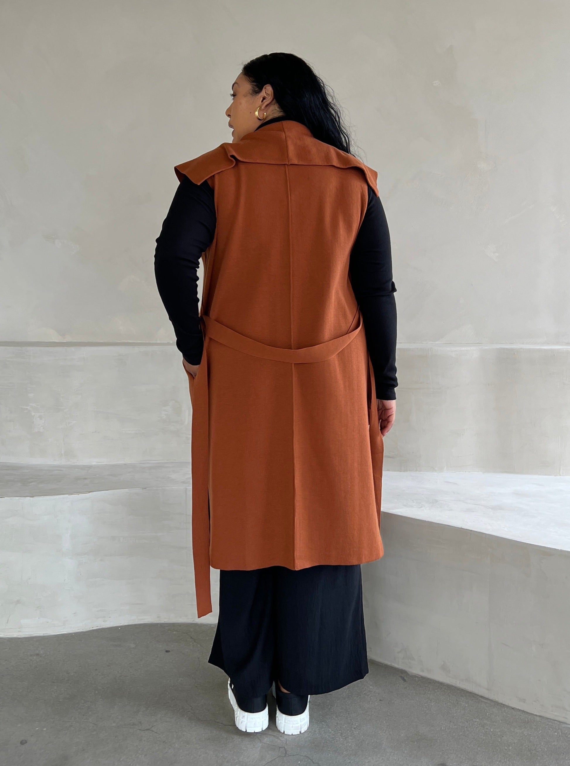 - This sleeveless coat features a?draping collar, a drawstring around the waist, and two pockets on each side.