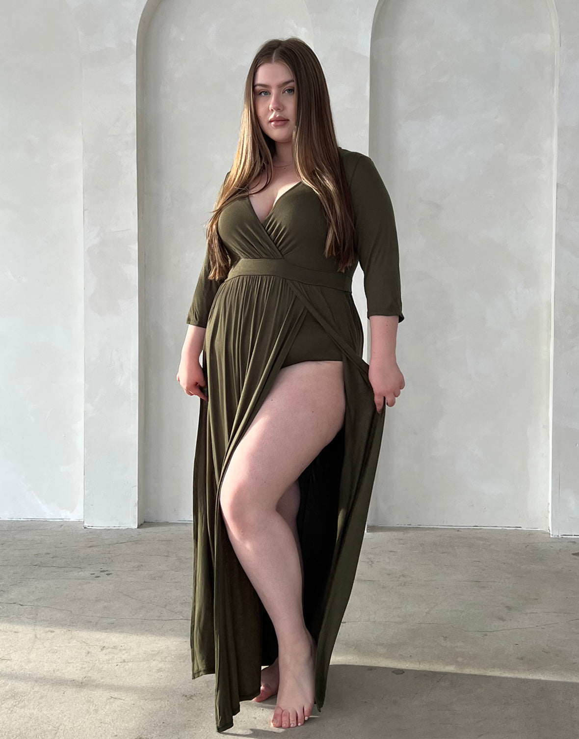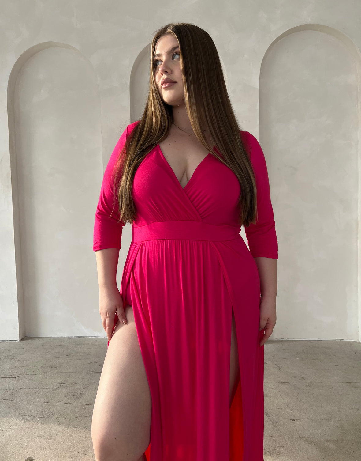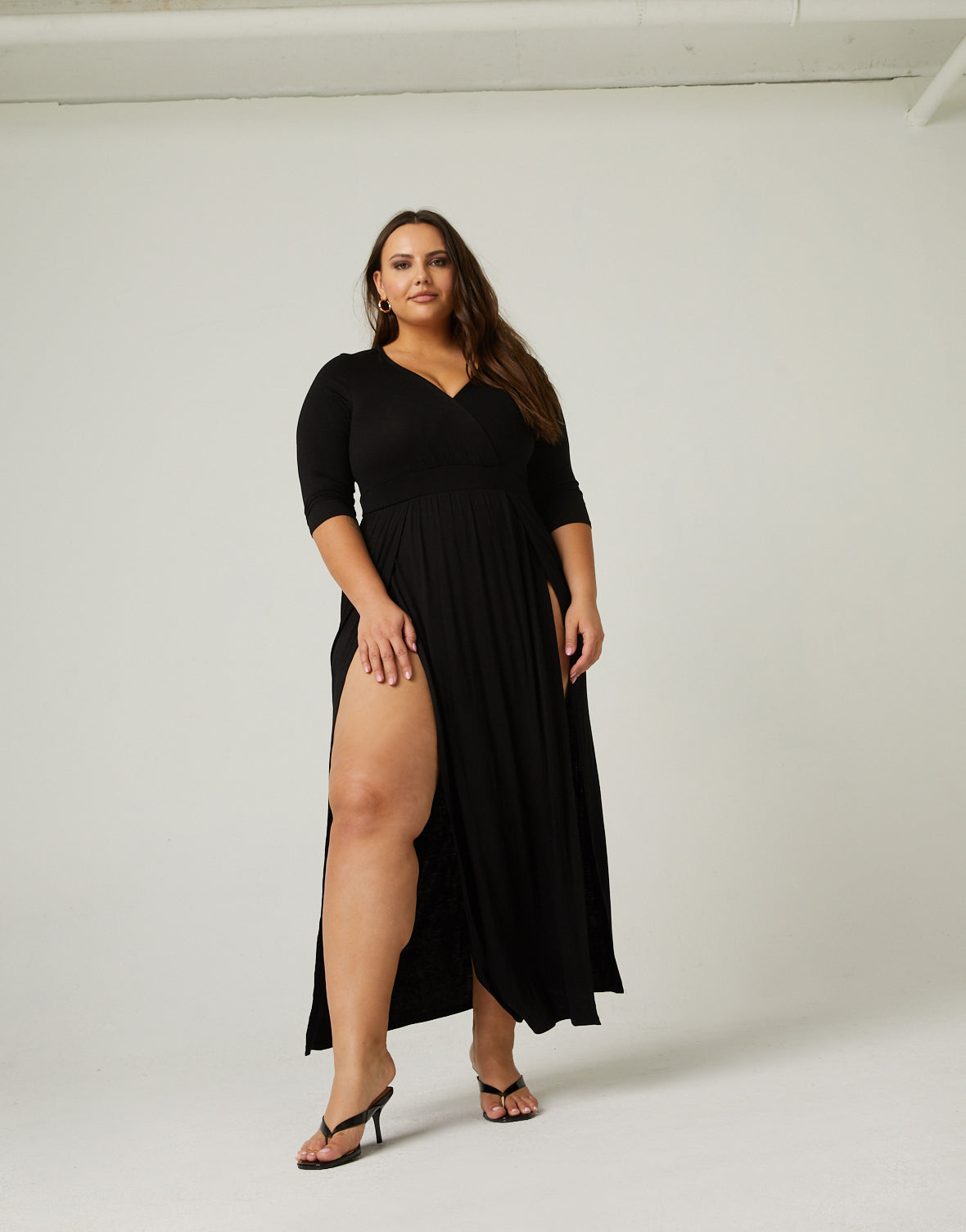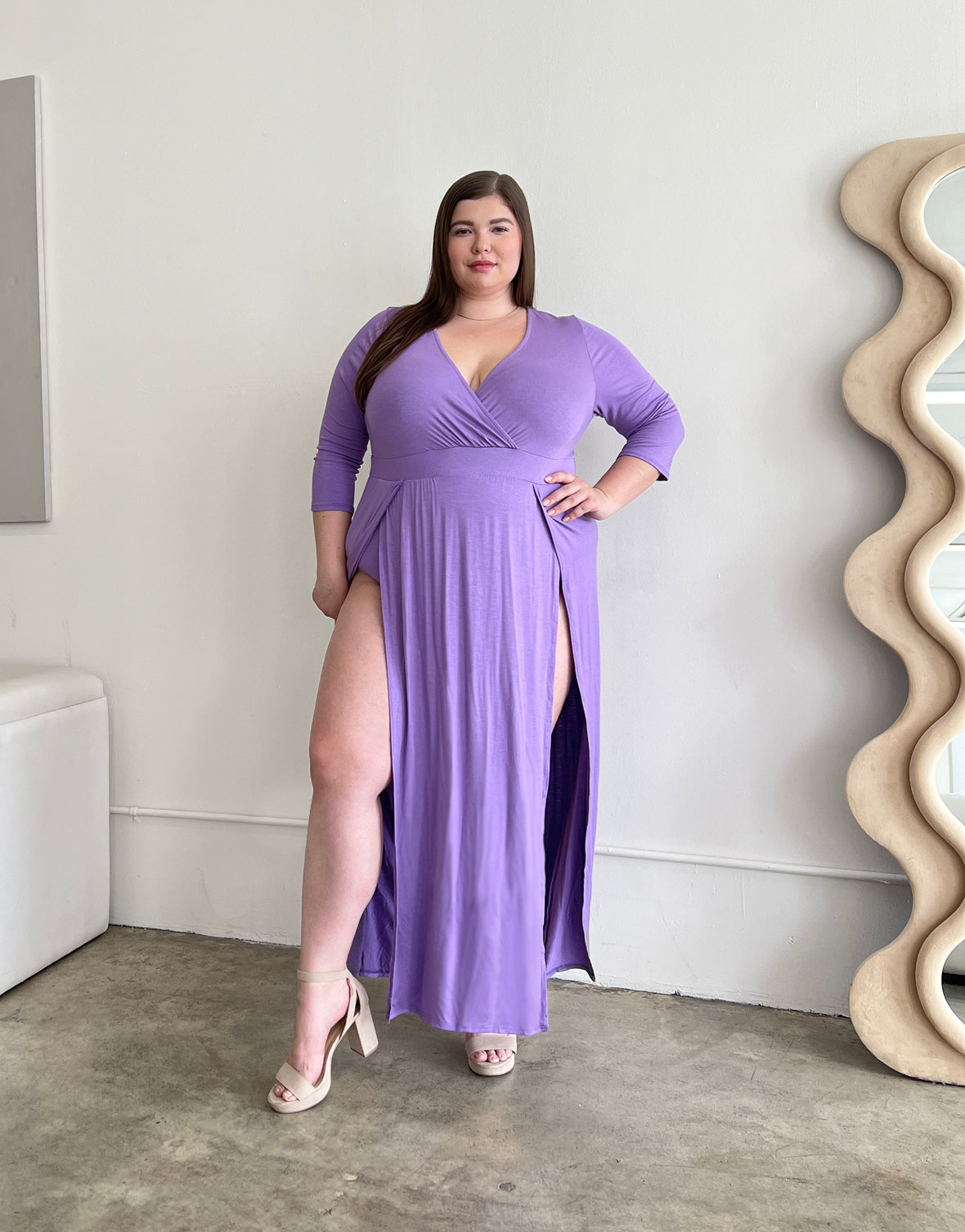 Need something a bit dressier to wear to your next date night or night out? Well, we've got you covered (sort of!) with?our?new?Plus Size Sultry Double Slit Dress! This plus size dress is?super?flirty and sassy, with 3/4 length sleeves, a deep v-neck, and two leg slits. And don't worry, it has a built-in bodysuit for full coverage! The bodysuit has snaps at the bottom for your convenience. The neckline just begs to?display some layered and the leg slits are ready to show off your long legs in your favorite strappy heels.?All you need for an evening out is this comfortable dress and a cute !