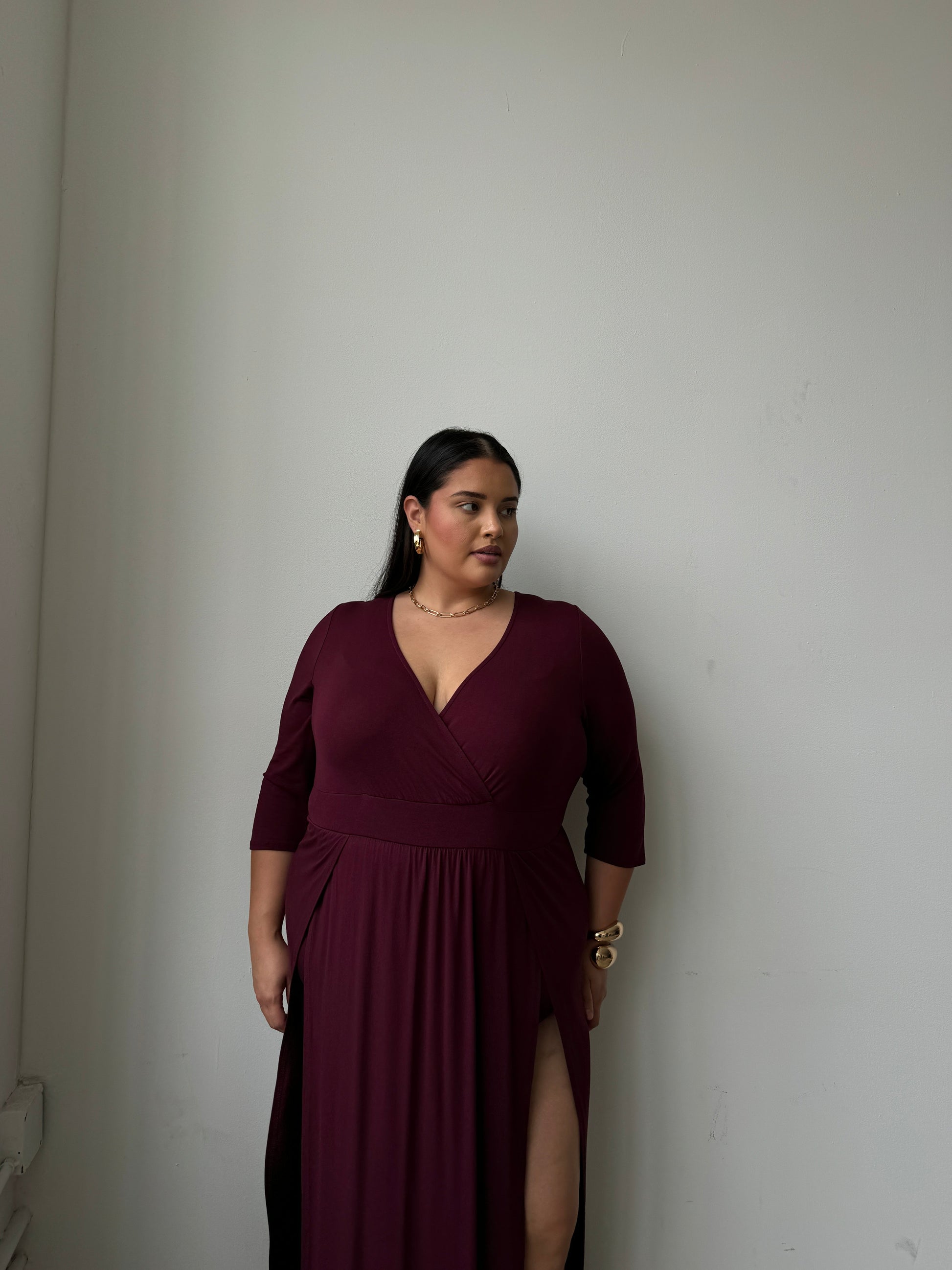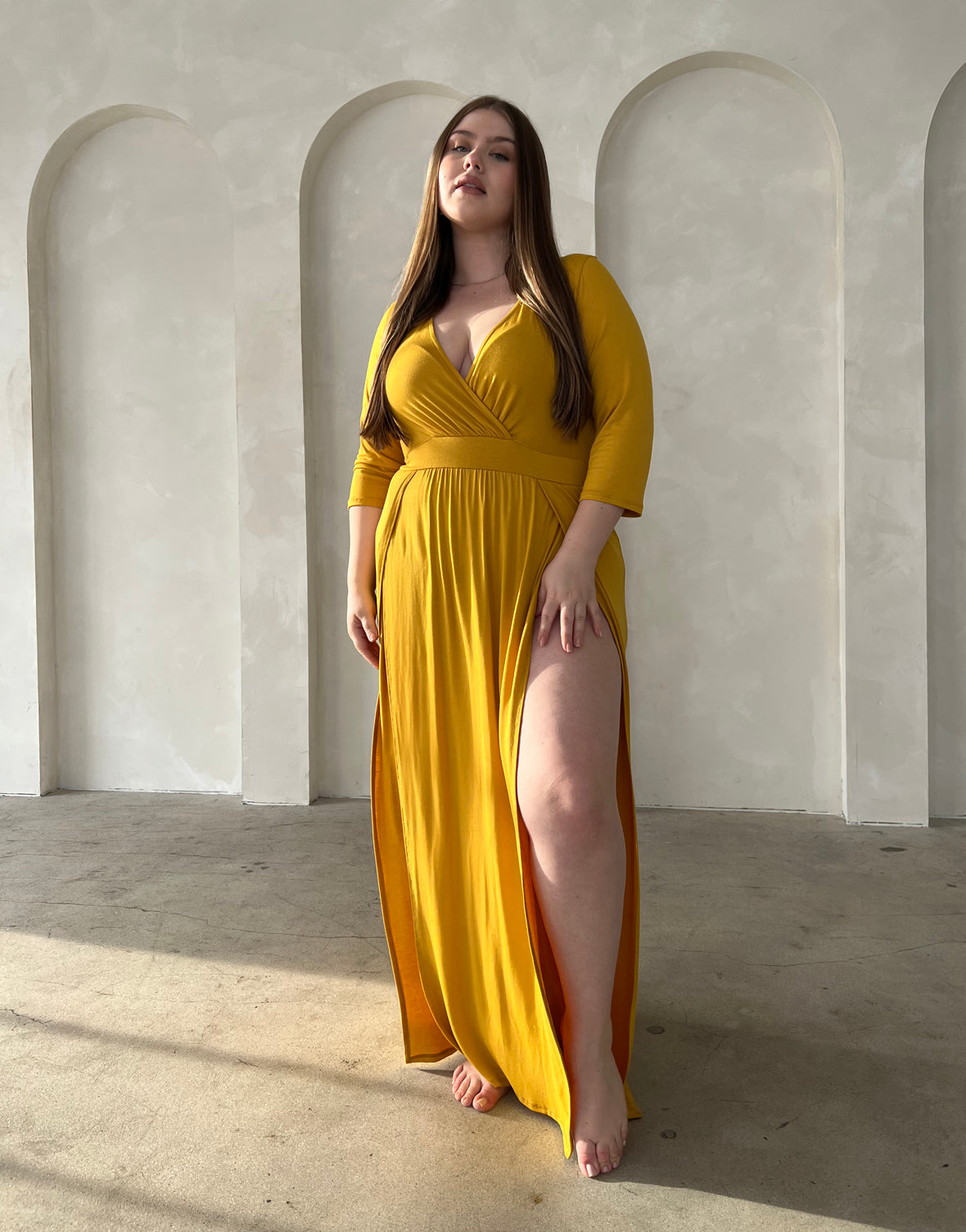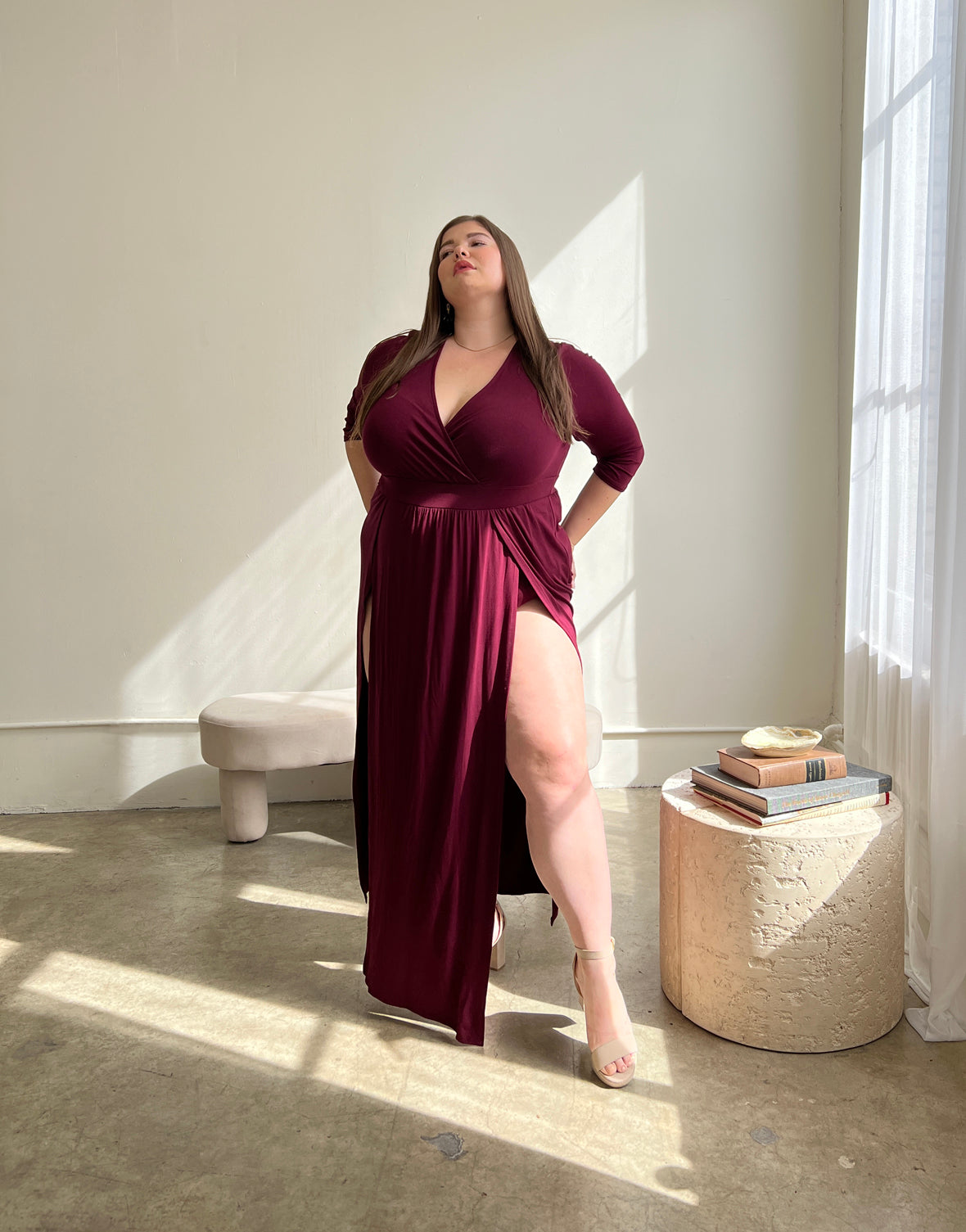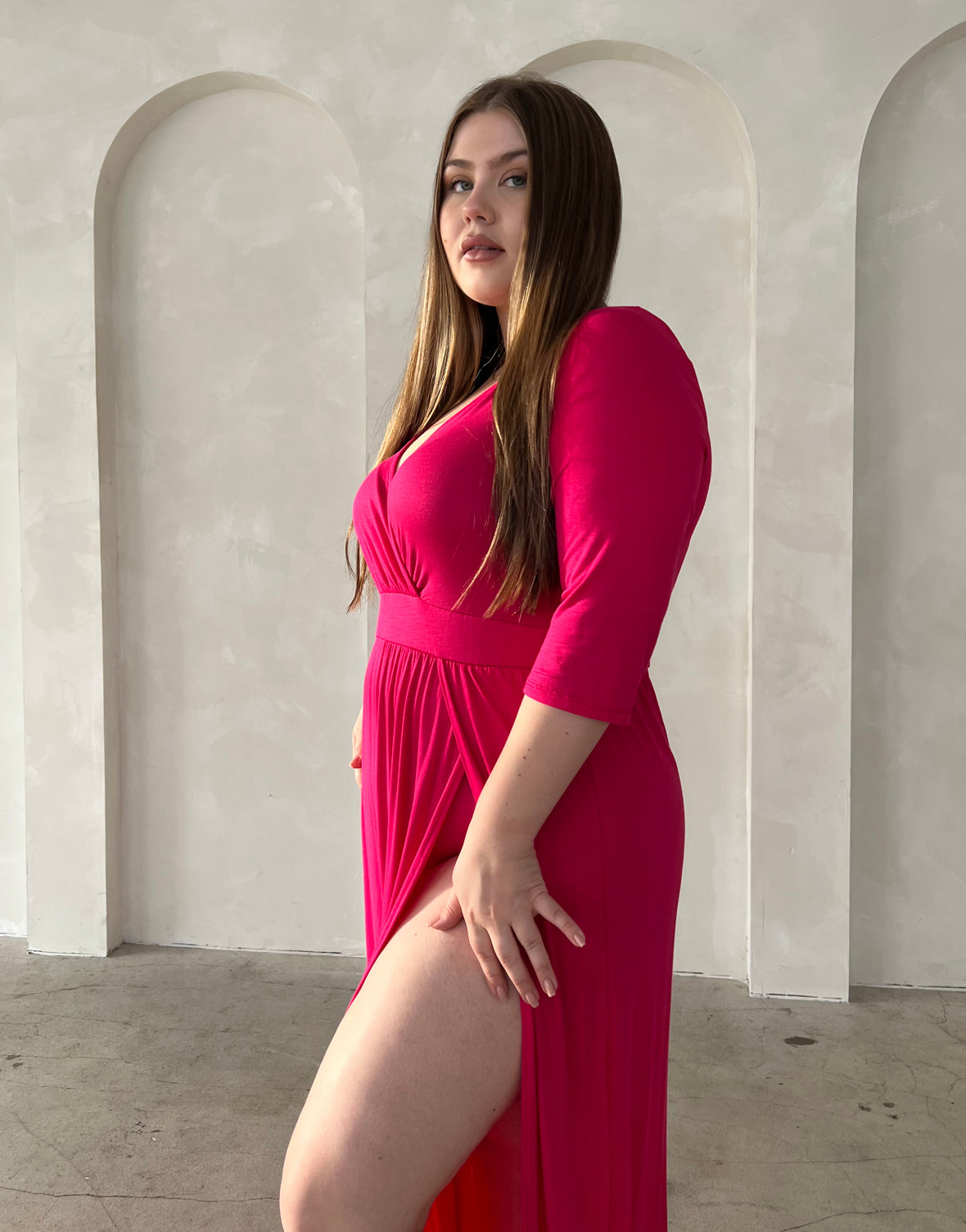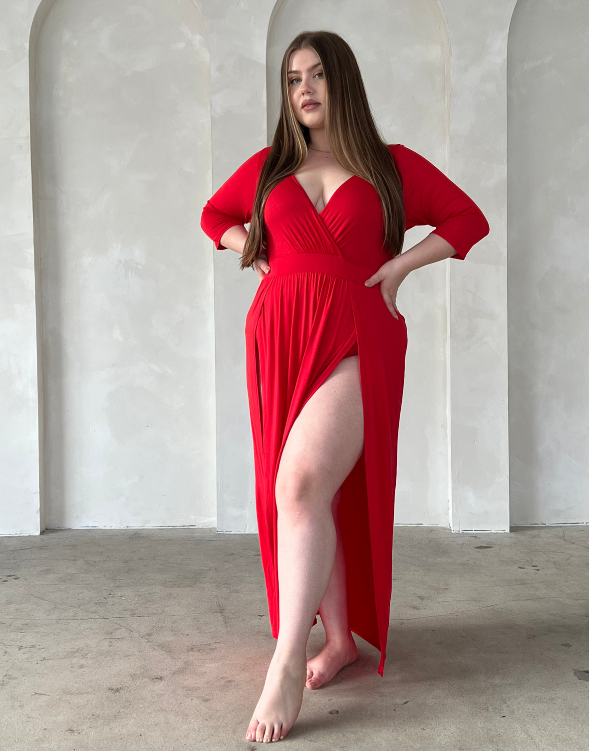 Need something a bit dressier to wear to your next date night or night out? Well, we've got you covered (sort of!) with?our?new?Plus Size Sultry Double Slit Dress! This plus size dress is?super?flirty and sassy, with 3/4 length sleeves, a deep v-neck, and two leg slits. And don't worry, it has a built-in bodysuit for full coverage! The bodysuit has snaps at the bottom for your convenience. The neckline just begs to?display some layered and the leg slits are ready to show off your long legs in your favorite strappy heels.?All you need for an evening out is this comfortable dress and a cute !