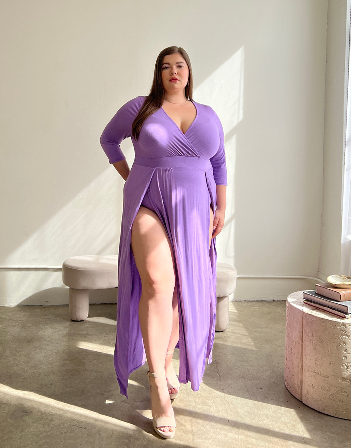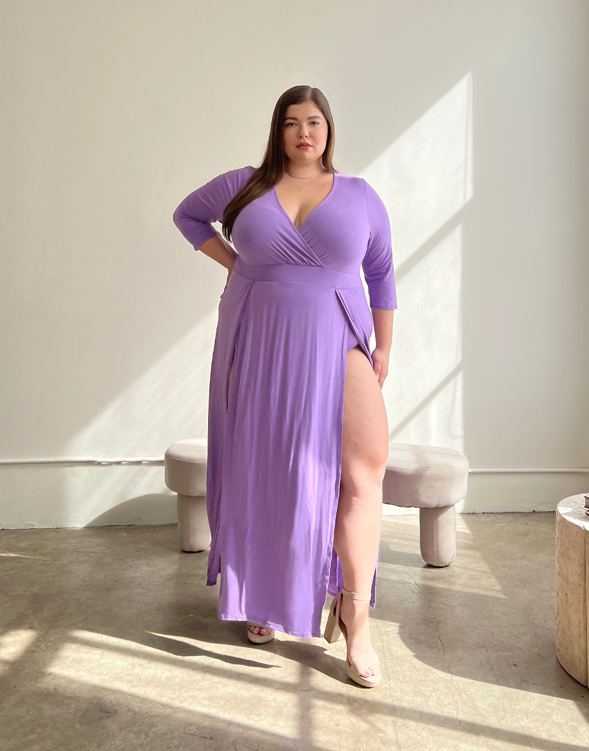 Model in purple is 5'8, with a 46.5 bust, 42 waist, 48 hips, and is wearing a size 3XL.
