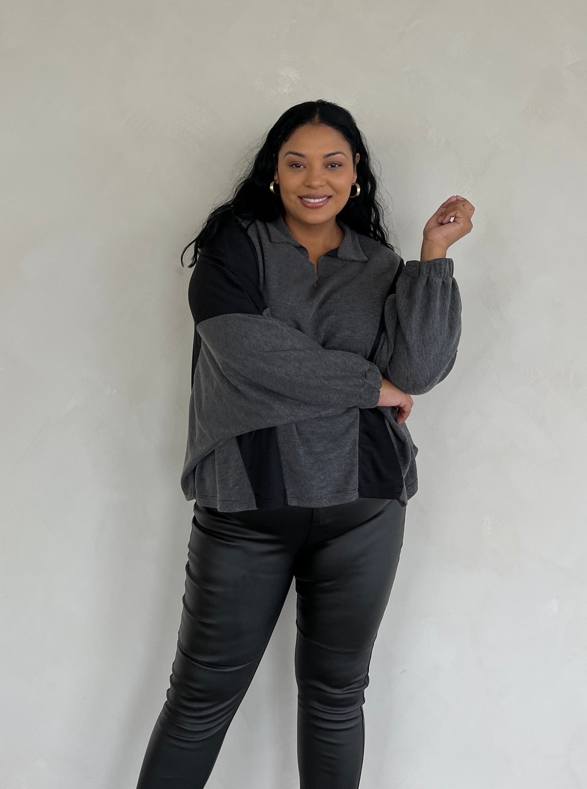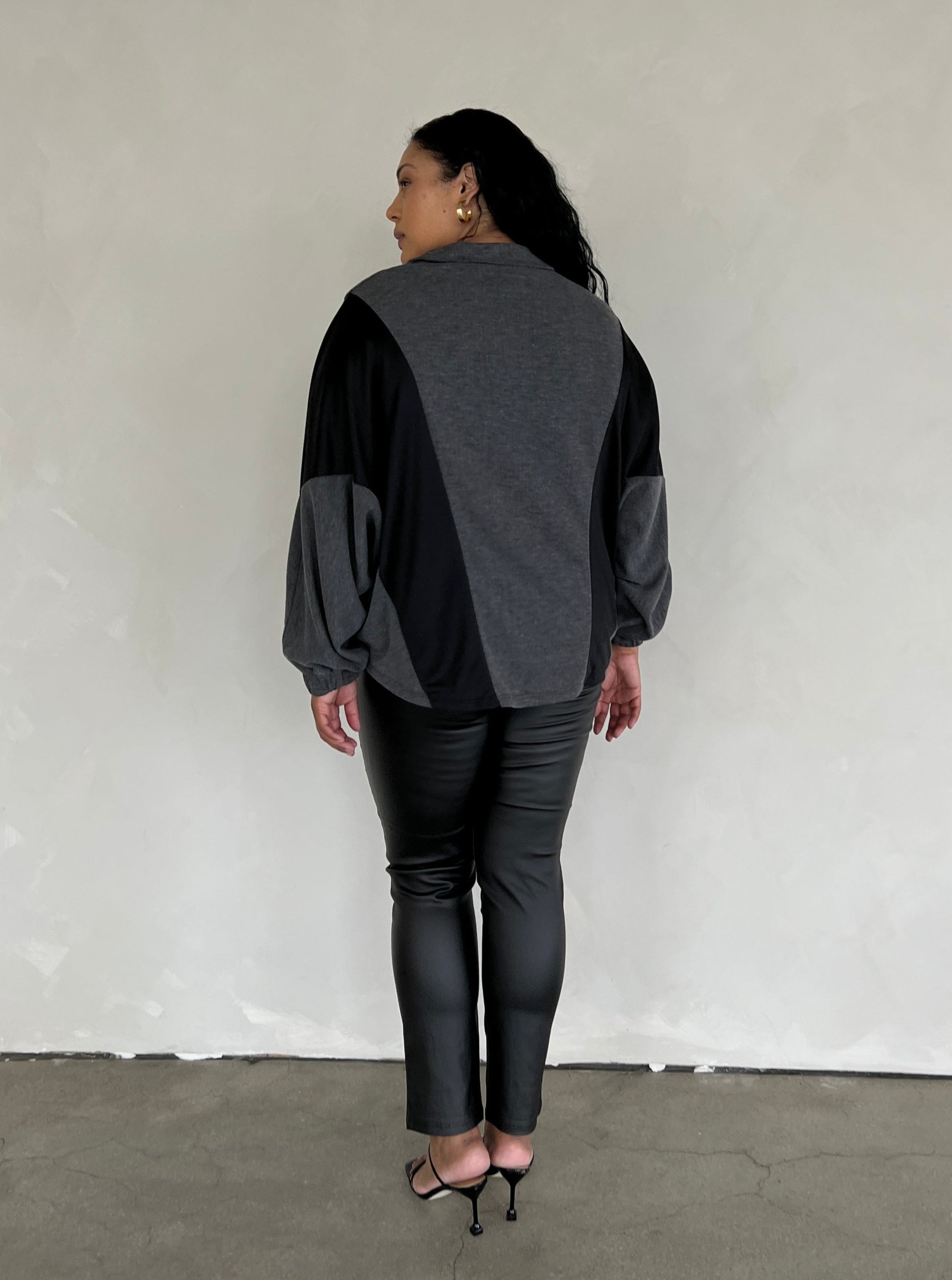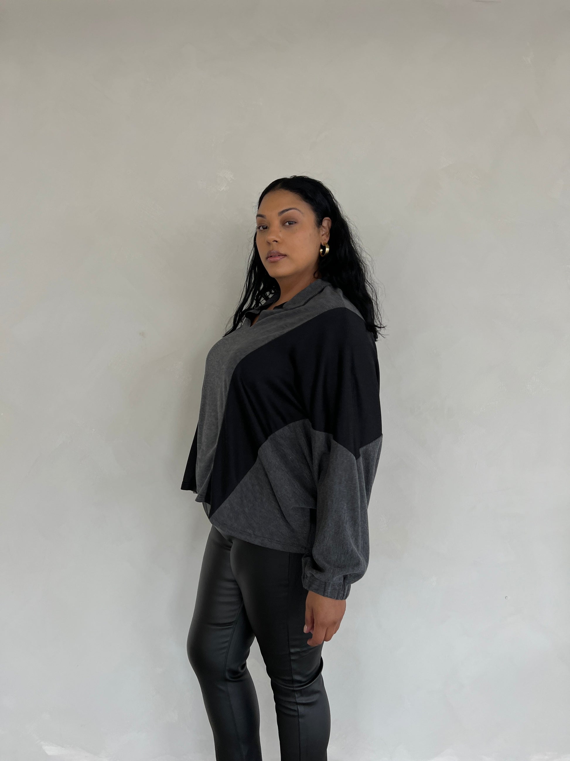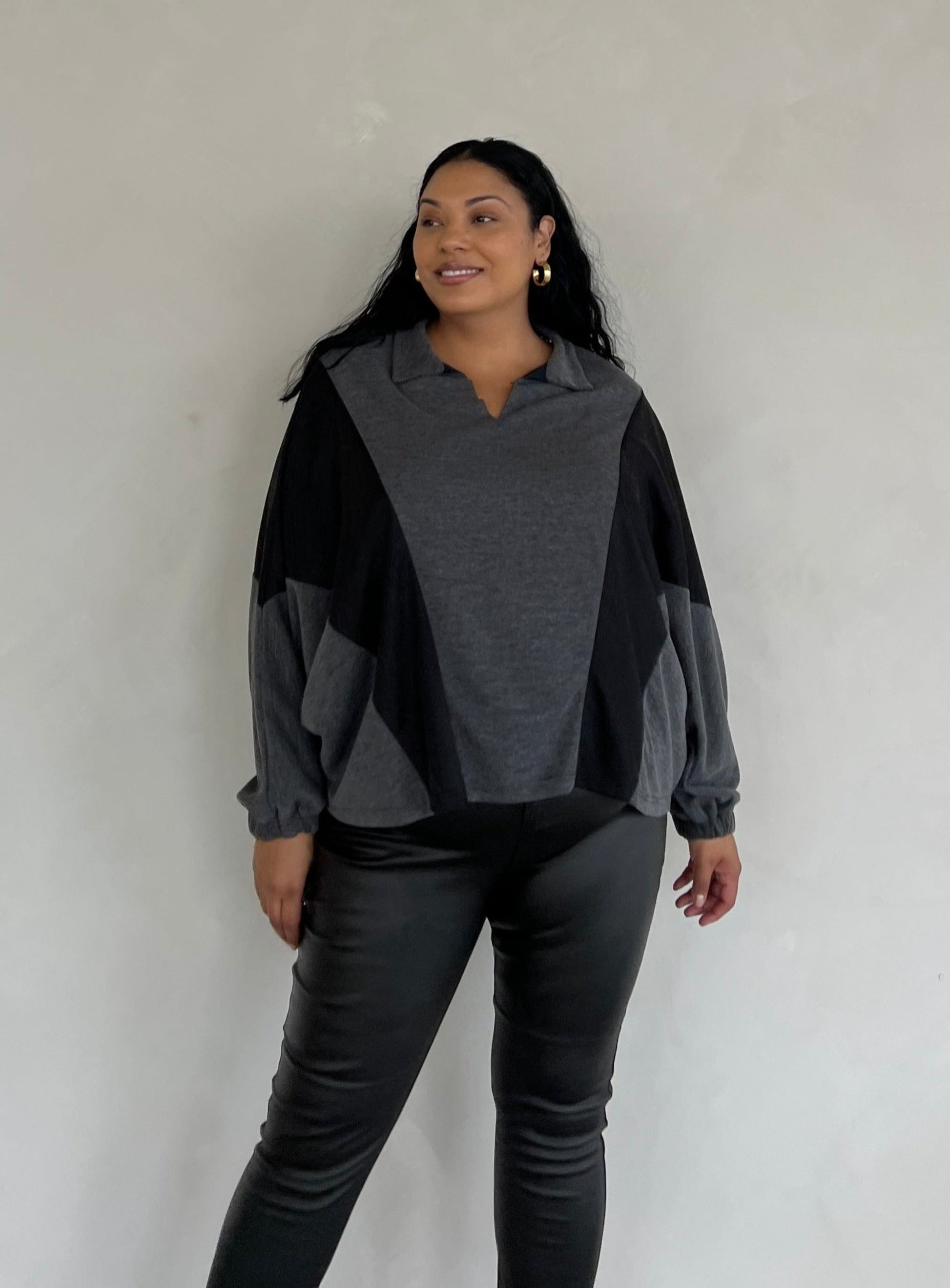 - This top features a two-toned, color block pattern, a folded-down collar, long sleeves, and a flowy, square-cut silhouette.