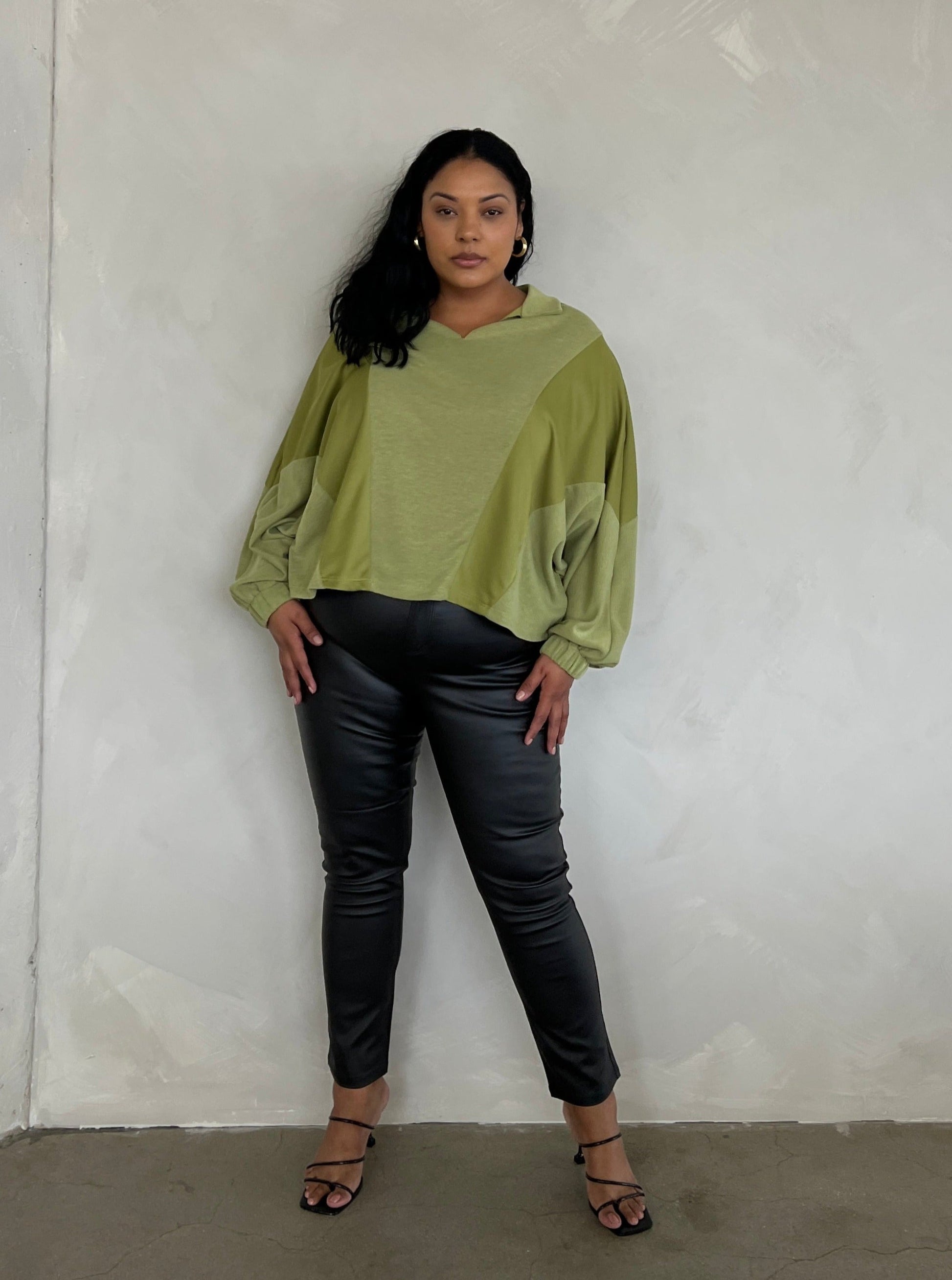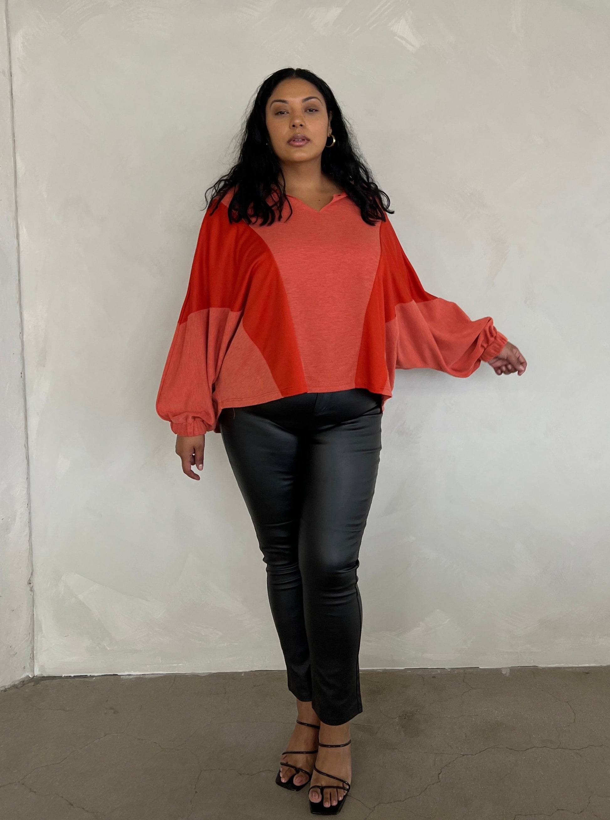 The Plus Size Two Tone Long Sleeve Top exudes sophistication and elegance.?The color block pattern and two-tone design create a bold and unique look that is perfect for the fashion-forward. We love it styled with a cool pair of leather ?for a fun and funky?outfit you'll love!
