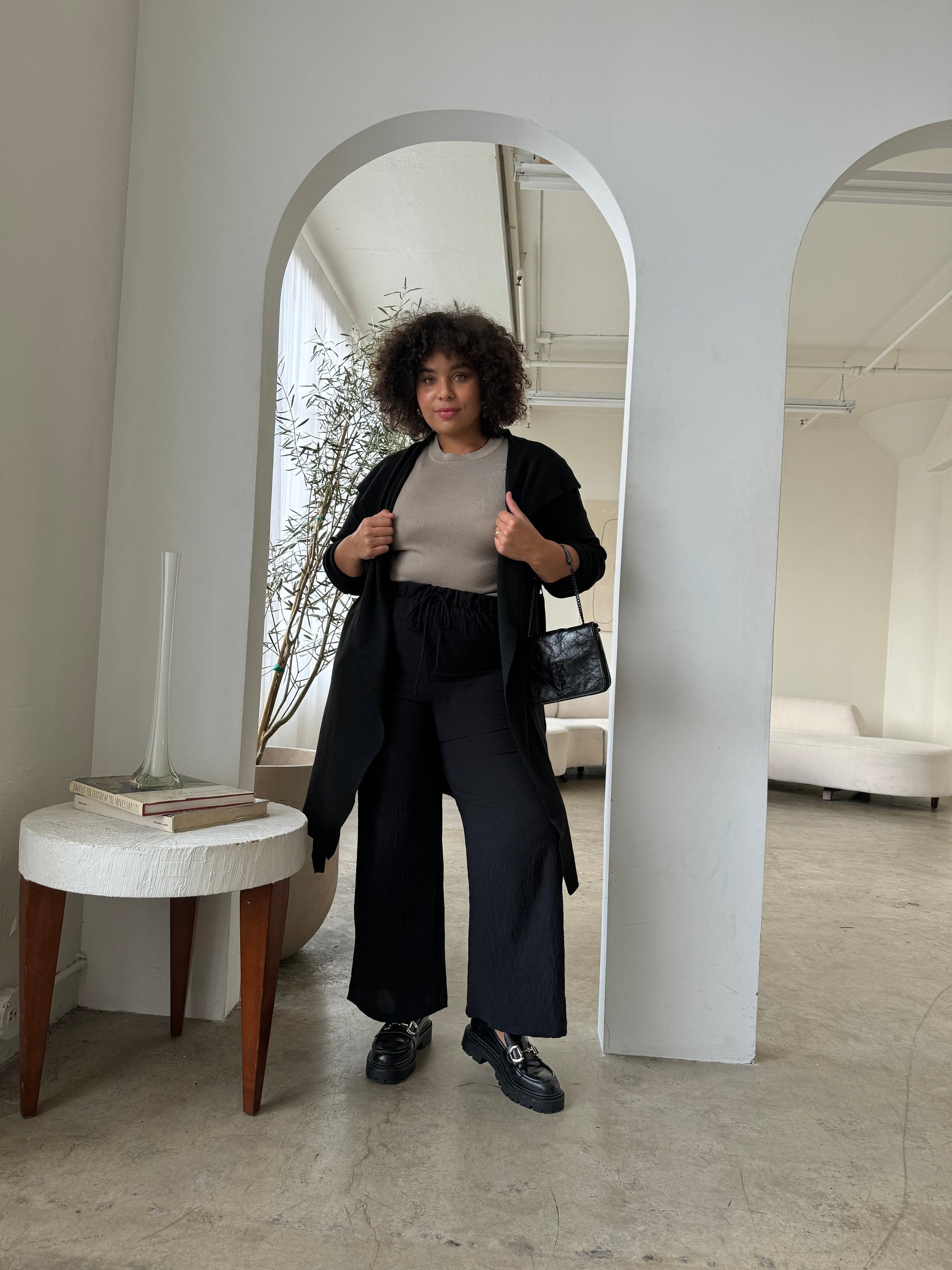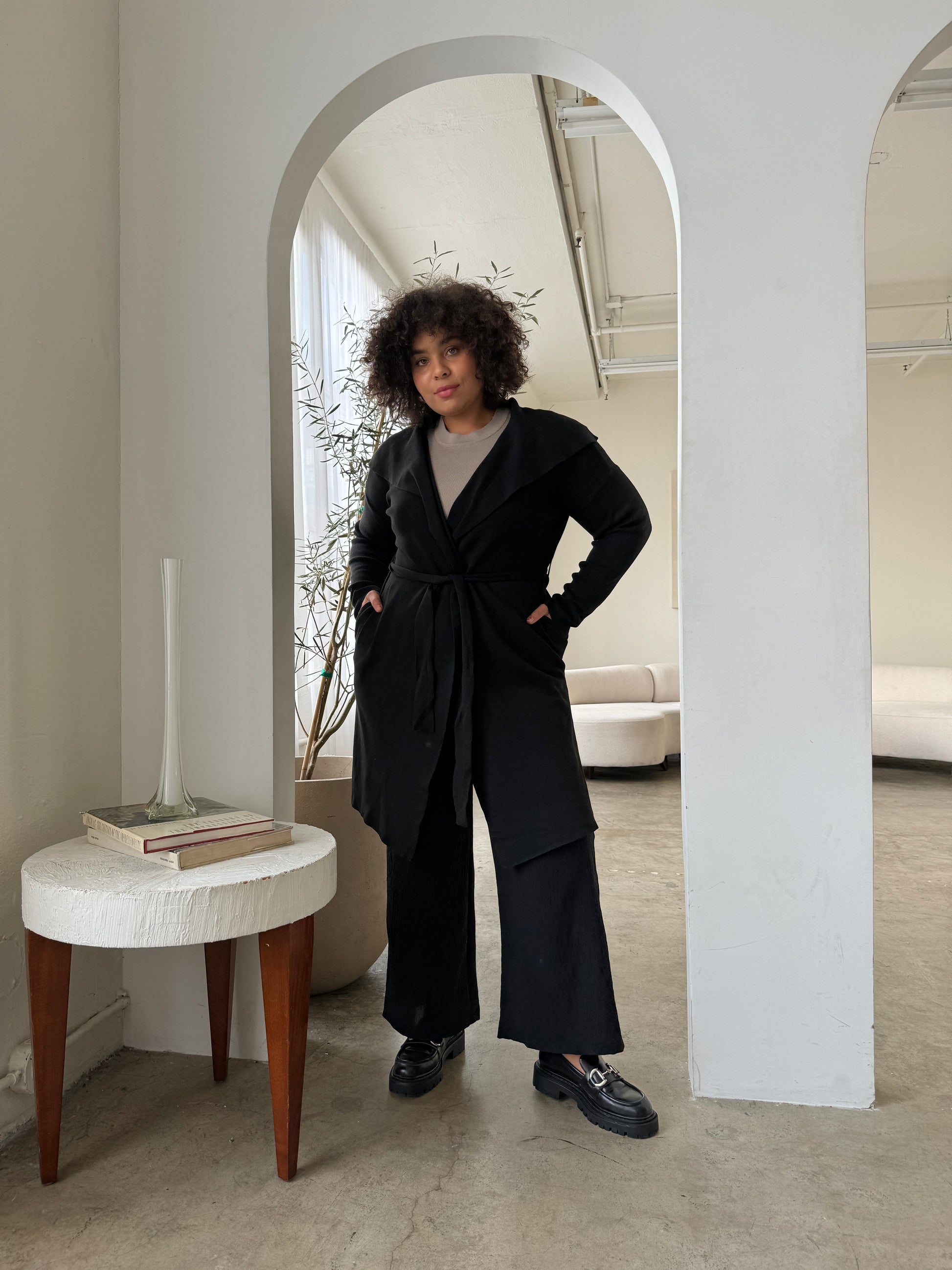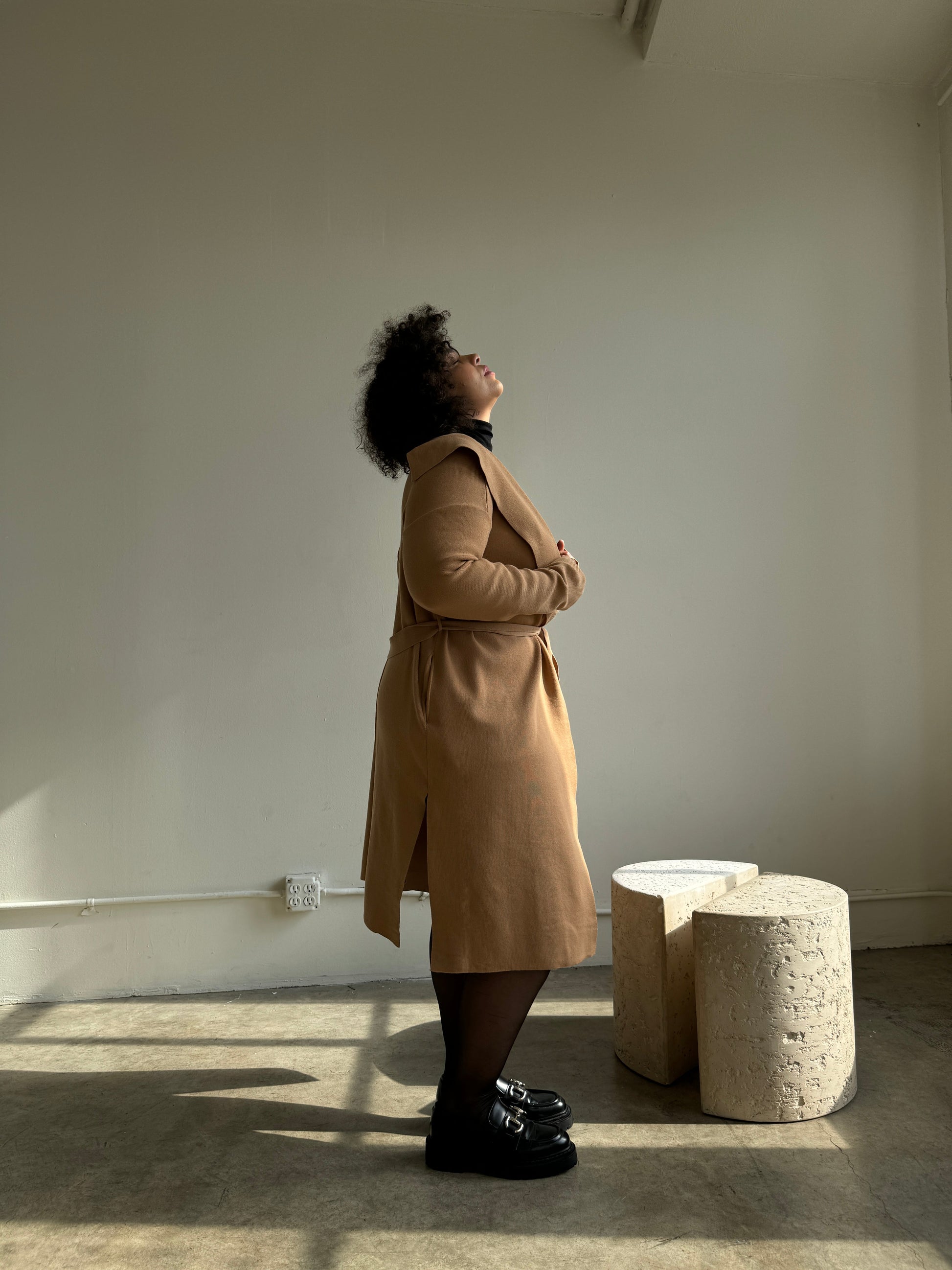 - This coat features two pockets, a draping collar, slits on the back, and a tie around the waist.